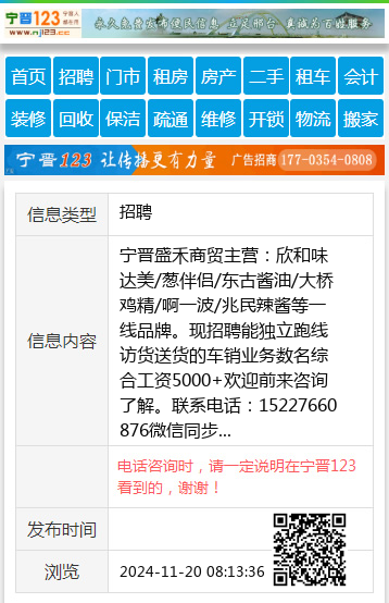 宁晋盛禾商贸主营:欣和味达美/葱伴侣/东古酱油/大桥鸡精/啊一波/兆民辣酱等一线品牌。现招聘能独立跑线访货送货的车销业务数名综合工资5000+欢迎前来咨询了解。联系电话:15227660876微信同步 【电话咨询时,请一定说明在宁晋123看到的,谢谢!】 |