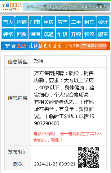 万方集团招聘:质检,销售内勤,要求:大专以上学历,40岁以下;身体健康,踏实细心,个人综合素质高;有相关经验者优先,工作地址在尧台,有食堂,薪资面议。(临时工勿扰)电话19903290400 【电话咨询时,请一定说明在宁晋123看到的,谢谢!】 |