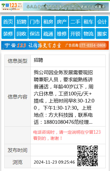 我公司因业务发展需要现招聘兼职人员,要求能熟练讲普通话,年龄40岁以下,周六日休息,工资100元/天+提成,上班时间早8:30-12:00, 下午1:30-17:30。上班地点:方大科技园,联系电话:18801080476范经理 【电话咨询时,请一定说明在宁晋123看到的,谢谢!】 |