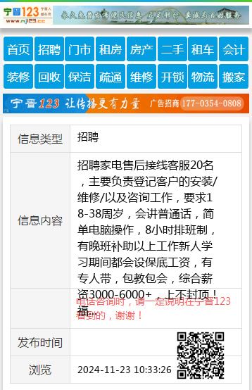 招聘家电售后接线客服20名,主要负责登记客户的安装/维修/以及咨询工作,要求18-38周岁,会讲普通话,简单电脑操作,8小时排班制,有晚班补助以上工作新人学习期间都会设保底工资,有专人带,包教包会,综合薪资3000-6000+,上不封顶!福利待遇:业绩红包+业绩奖品+绩效奖金 +过节福利+日常福利(水果,零食供应) 工作环境好,人事关系简单,欢迎踊跃报名。
