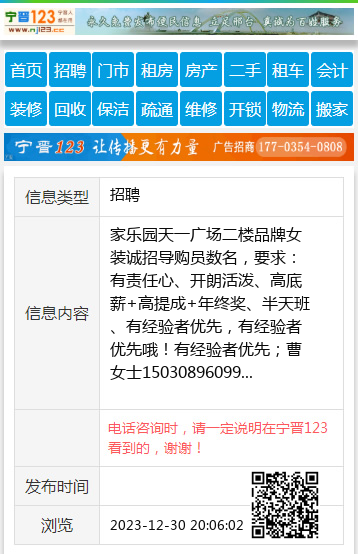 家乐园天一广场二楼品牌女装诚招导购员数名,要求:有责任心、开朗活泼、高底薪+高提成+年终奖、半天班、有经验者优先,有经验者优先哦!有经验者优先;曹女士15030896099 【电话咨询时,请一定说明在宁晋123看到的,谢谢!】 |