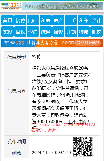 招聘家电售后接线客服20名,主要负责登记客户的安装/维修/以及咨询工作,要求18-38周岁,会讲普通话,简单电脑操作,8小时排班制,有晚班补助以上工作新人学习期间都会设保底工资,有专人带,包教包会,综合薪资3000-6000+,上不封顶!福利待遇:业绩红包+业绩奖品+绩效奖金 +过节福利+日常福利(水果,零食供应) 工作环境好,人事关系简单,欢迎踊跃报名。