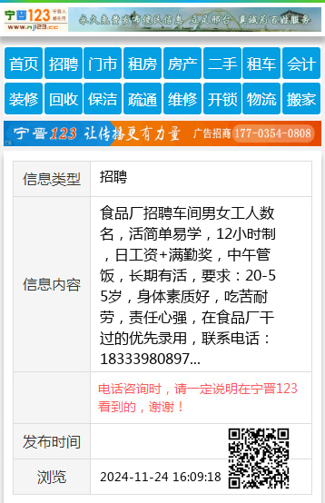 食品厂招聘车间男女工人数名,活简单易学,12小时制,日工资+满勤奖,中午管饭,长期有活,要求:20-55岁,身体素质好,吃苦耐劳,责任心强,在食品厂干过的优先录用,联系电话:18333980897 【电话咨询时,请一定说明在宁晋123看到的,谢谢!】 |