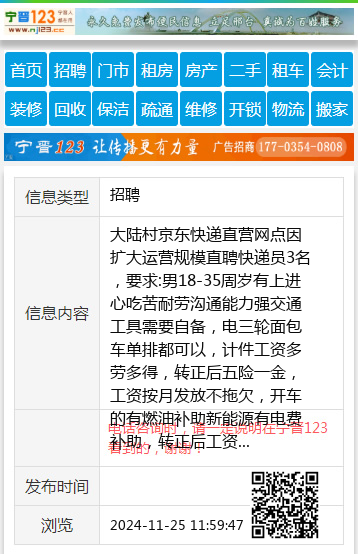 大陆村京东快递直营网点因扩大运营规模直聘快递员3名,要求:男18-35周岁有上进心吃苦耐劳沟通能力强交通工具需要自备,电三轮面包车单排都可以,计件工资多劳多得,转正后五险一金,工资按月发放不拖欠,开车的有燃油补助新能源有电费补助,转正后工资6000-10000+大公司稳定靠谱,人品有问题勿扰!电话微信同号:13653337464 【电话咨询时,请一定说明在宁晋123看到的,谢谢!】 |