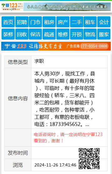 本人男30岁,现找工作,县城内,可长期(最好有月休)、可临时,有十多年的驾驶经验(轿车,三米八、四米二的包厢,货车都能开),吃苦耐劳,各种零活,小工都可,有意的老板电联,电话:18733945652。 【电话咨询时,请一定说明在宁晋123看到的,谢谢!】 |
