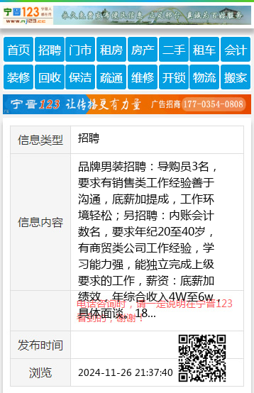 品牌男装招聘:导购员3名,要求有销售类工作经验善于沟通,底薪加提成,工作环境轻松;另招聘:内账会计数名,要求年纪20至40岁,有商贸类公司工作经验,学习能力强,能独立完成上级要求的工作,薪资:底薪加绩效,年综合收入4W至6w,具体面谈。18201653017,18132900886 【电话咨询时,请一定说明在宁晋123看到的,谢谢!】 |