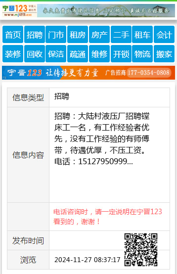 招聘:大陆村液压厂招聘镗床工一名,有工作经验者优先,没有工作经验的有师傅带,待遇优厚,不压工资。电话:15127950999 【电话咨询时,请一定说明在宁晋123看到的,谢谢!】 |