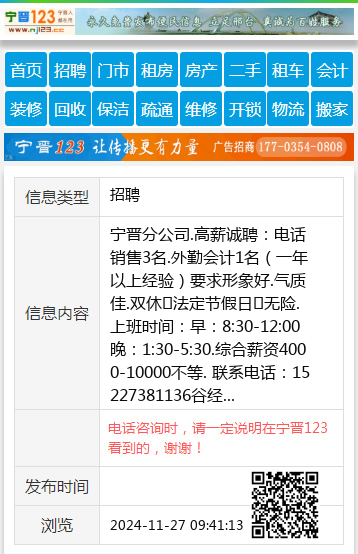 宁晋分公司.高薪诚聘:电话销售3名.外勤会计1名(一年以上经验)要求形象好.气质佳.双休➕法定节假日➕无险.上班时间:早:8:30-12:00 晚:1:30-5:30.综合薪资4000-10000不等. 联系电话:15227381136谷经理 【电话咨询时,请一定说明在宁晋123看到的,谢谢!】 |
