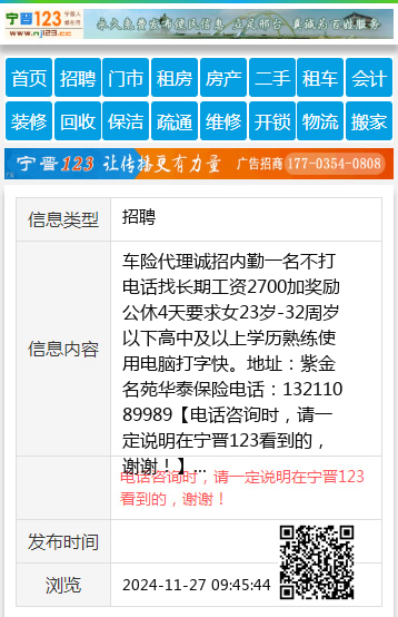 车险代理诚招内勤一名不打电话找长期工资2700加奖励公休4天要求女23岁-32周岁以下高中及以上学历熟练使用电脑打字快。地址:紫金名苑华泰保险电话:13211089989【电话咨询时,请一定说明在宁晋123看到的,谢谢!】 【电话咨询时,请一定说明在宁晋123看到的,谢谢!】 |
