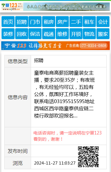 童泰电商高薪招聘童装女主播,要求20至35岁;有夜班,有无经验均可以,五险有公休,氛围好工作环境好,联系电话03195515595地址西城区西华路童泰供应链二楼行政部欢迎报名 【电话咨询时,请一定说明在宁晋123看到的,谢谢!】 |