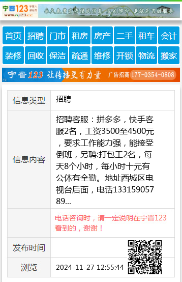 招聘客服:拼多多,快手客服2名,工资3500至4500元,要求工作能力强,能接受倒班,另聘:打包工2名,每天8个小时,每小时十元有公休有全勤。地址西城区电视台后面,电话13315905789 【电话咨询时,请一定说明在宁晋123看到的,谢谢!】 |