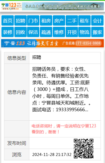 招聘话务员,要求:女性、负责任、有销售经验者优先录用。待遇优厚。工资:底薪(3000)+提成,日工作八小时,每周日单休。工作地点:宁晋县城天和城附近。。面试电话:19333995666 【电话咨询时,请一定说明在宁晋123看到的,谢谢!】 |
