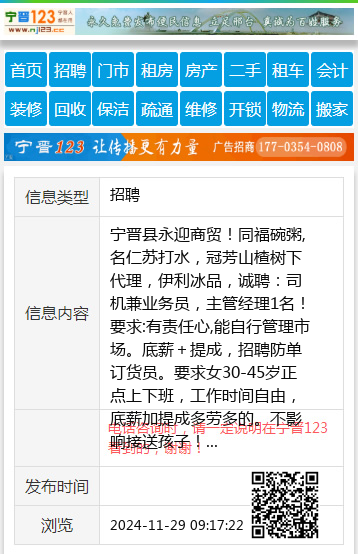 宁晋县永迎商贸!同福碗粥,名仁苏打水,冠芳山楂树下代理,伊利冰品,诚聘:司机兼业务员,主管经理1名!要求:有责任心,能自行管理市场。底薪+提成,招聘防单订货员。要求女30-45岁正点上下班,工作时间自由,底薪加提成多劳多的。不影响接送孩子!地址:蔬菜市场北门,电话15175930450 【电话咨询时,请一定说明在宁晋123看到的,谢谢!】 |
