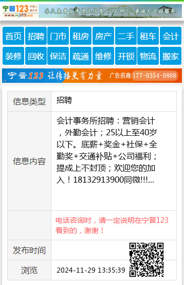 会计事务所招聘:营销会计,外勤会计;25以上至40岁以下。底薪+奖金+社保+全勤奖+交通补贴+公司福利;提成上不封顶;欢迎您的加入!18132913900同微!!! 【电话咨询时,请一定说明在宁晋123看到的,谢谢!】 |