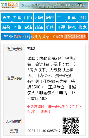 诚聘:内勤文员2名、销售2名、会计1名,要求:女、35周岁以下、大专及以上学历、口齿伶俐、责任心强,有相关工作经验者优先,待遇3500+,正规单位,非诚勿扰!非诚勿扰!电话:15530152308 【电话咨询时,请一定说明在宁晋123看到的,谢谢!】 |