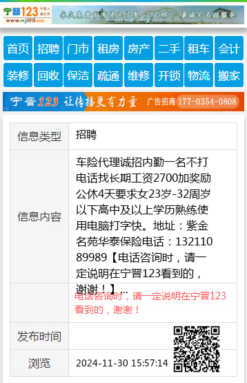 车险代理诚招内勤一名不打电话找长期工资2700加奖励公休4天要求女23岁-32周岁以下高中及以上学历熟练使用电脑打字快。地址:紫金名苑华泰保险电话:13211089989【电话咨询时,请一定说明在宁晋123看到的,谢谢!】 【电话咨询时,请一定说明在宁晋123看到的,谢谢!】 |