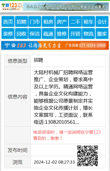 大陆村机械厂招聘网络运营推广、企业策划,要求高中及以上学历。精通网络运营,具备企业文化构建能力,能够根据公司愿景制定并实施企业文化传播计划,擅长文案撰写,工资面议,联系电话:13082010561 【电话咨询时,请一定说明在宁晋123看到的,谢谢!】 |