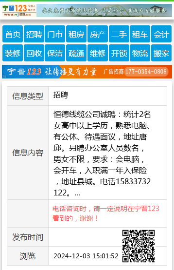 恒德线缆公司诚聘:统计2名女高中以上学历,熟悉电脑、有公休、待遇面议,地址唐邱。另聘办公室人员数名,男女不限,要求:会电脑,会开车,入职满一年入保险,地址县城。电话15833732122。 【电话咨询时,请一定说明在宁晋123看到的,谢谢!】 |