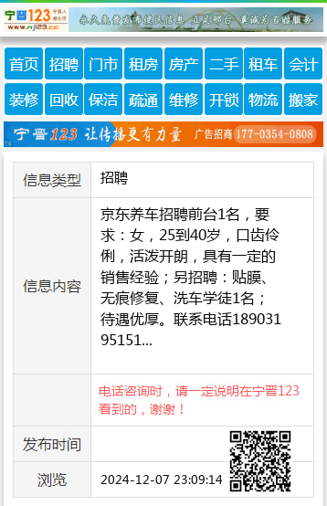 京东养车招聘前台1名,要求:女,25到40岁,口齿伶俐,活泼开朗,具有一定的销售经验;另招聘:贴膜、无痕修复、洗车学徒1名;待遇优厚。联系电话18903195151 【电话咨询时,请一定说明在宁晋123看到的,谢谢!】 |