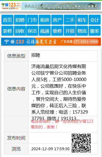济南流量后厨文化传媒有限公司驻宁晋分公司招聘业务人员5名,工资5000-10000元,公司氛围好,在快乐中工作,实现自己的人生价值,晋升空间大,期待热爱传媒的你,转正后入三险,联系人范经理:电话:15732937793 微信(19131335680 【电话咨询时,请一定说明在宁晋123看到的,谢谢!】 |