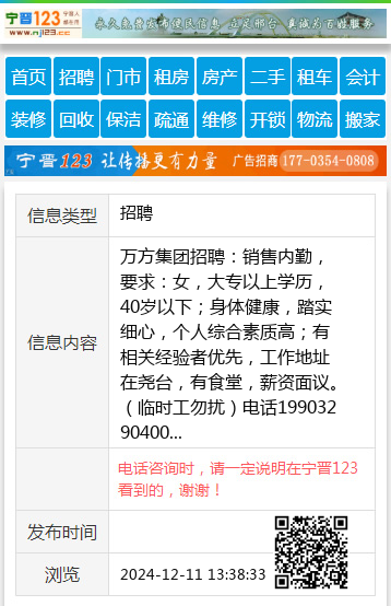 万方集团招聘:销售内勤,要求:女,大专以上学历,40岁以下;身体健康,踏实细心,个人综合素质高;有相关经验者优先,工作地址在尧台,有食堂,薪资面议。(临时工勿扰)电话19903290400 【电话咨询时,请一定说明在宁晋123看到的,谢谢!】 |