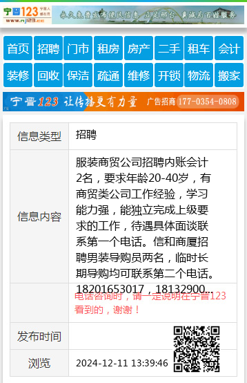 服装商贸公司招聘内账会计2名,要求年龄20-40岁,有商贸类公司工作经验,学习能力强,能独立完成上级要求的工作,待遇具体面谈联系第一个电话。信和商厦招聘男装导购员两名,临时长期导购均可联系第二个电话。18201653017,18132900886 【电话咨询时,请一定说明在宁晋123看到的,谢谢!】 |