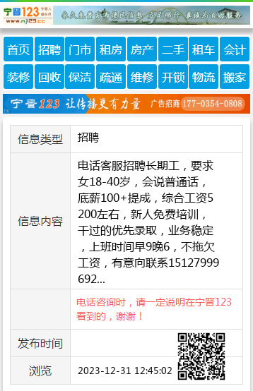 电话客服招聘长期工,要求女18-40岁,会说普通话,底薪100+提成,综合工资5200左右,新人免费培训,干过的优先录取,业务稳定,上班时间早9晚6,不拖欠工资,有意向联系15127999692 【电话咨询时,请一定说明在宁晋123看到的,谢谢!】 |