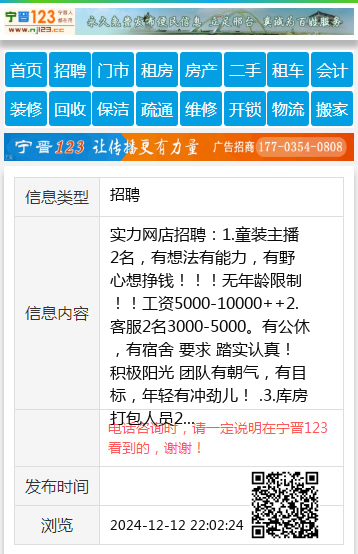 实力网店招聘:1.童装主播 2名,有想法有能力,有野心想挣钱!!!无年龄限制!!工资5000-10000++2. 客服2名3000-5000。有公休,有宿舍 要求 踏实认真!积极阳光 团队有朝气,有目标,年轻有冲劲儿! .3.库房打包人员2名,长白班。库房有空调!有工作经验者优先录用!!!!!3.地址:东亚 菜市场 大医院附近 县城 ,联系电话15533197597 【电话咨询时,请一定说明在宁晋123看到的,谢谢!】 |