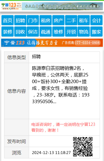 陈源泰白茶招聘销售2名,早晚班,公休两天,底薪2500+饭补300+全勤200+提成,要求女性,有销售经验,23-38岁。联系电话:19333950506 【电话咨询时,请一定说明在宁晋123看到的,谢谢!】 |