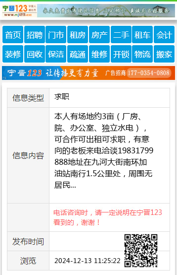本人有场地约3亩(厂房、院、办公室、独立水电),可合作可出租可求职,有意向的老板来电洽谈19831799888地址在九河大街南环加油站南行1.5公里处,周围无居民 【电话咨询时,请一定说明在宁晋123看到的,谢谢!】 |