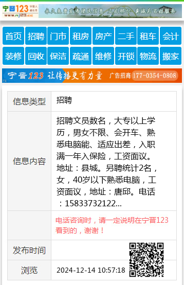 招聘文员数名,大专以上学历,男女不限、会开车、熟悉电脑能、适应出差,入职满一年入保险,工资面议。地址:县城。另聘统计2名,女,40岁以下熟悉电脑,工资面议,地址:唐邱。电话:15833732122 【电话咨询时,请一定说明在宁晋123看到的,谢谢!】 |