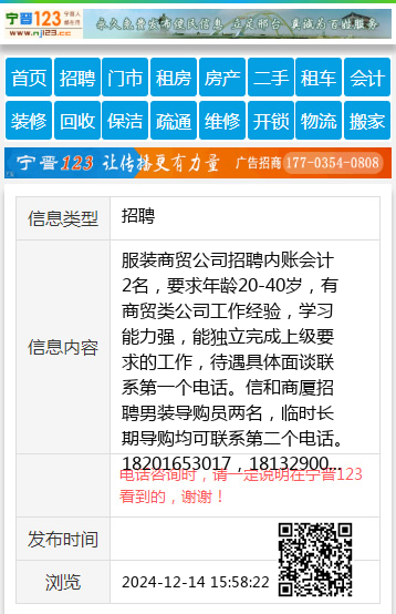 服装商贸公司招聘内账会计2名,要求年龄20-40岁,有商贸类公司工作经验,学习能力强,能独立完成上级要求的工作,待遇具体面谈联系第一个电话。信和商厦招聘男装导购员两名,临时长期导购均可联系第二个电话。18201653017,18132900886 【电话咨询时,请一定说明在宁晋123看到的,谢谢!】 |