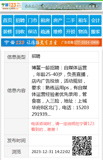 博鳌一龄招聘:自媒体运营,年龄25-40岁,负责直播,店内广告投放,活动规划,要求:熟练运用ps,有自媒体运营经验者优先录用,管食宿,入三险,地址:上城华府B区北门,电话:15203291939 【电话咨询时,请一定说明在宁晋123看到的,谢谢!】 |