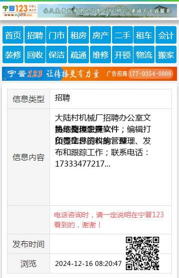 负责信息的收集、整理、发布和跟踪工作;联系电话:17333477217 【电话咨询时,请一定说明在宁晋123看到的,谢谢!】 |