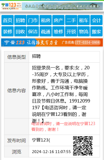 招登录员一名,要求:女,20-35周岁,大专及以上学历,形象好,善于沟通,电脑操作熟练。工作环境干净冬暖夏凉,八小时工作制,每周日及节假日休息。19912099197 【电话咨询时,请一定说明在宁晋123看到的,谢谢!】 |
