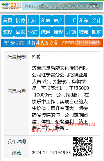 济南流量后厨文化传媒有限公司驻宁晋分公司招聘业务人员5名,招摄影,剪辑学员,可带薪培训,工资5000-10000元,公司氛围好,在快乐中工作,实现自己的人生价值,晋升空间大,期待热爱传媒的你,公司定期团建,体检,聚餐福利,转正后入三险,联系人范经理:电话:15732937793 【电话咨询时,请一定说明在宁晋123看到的,谢谢!】 |