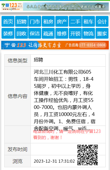 河北三川化工有限公司605车间开始招工:男性,18-45周岁,初中以上学历,身体健康,无不良嗜好,有化工操作经验优先,月工资5500-7000。也招内蒙外调人员,月工资10000元左右,4月份外调。1、免费住宿,宿舍配备空调、暖气、wifi等
