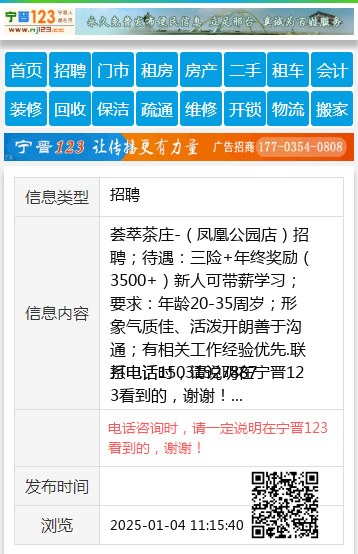 荟萃茶庄-(凤凰公园店)招聘;待遇:三险+年终奖励(3500+)新人可带薪学习;要求:年龄20-35周岁;形象气质佳、活泼开朗善于沟通;有相关工作经验优先.联系电话15031927887