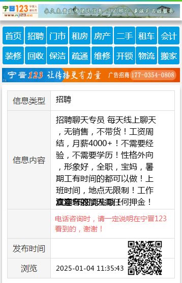 招聘聊天专员 每天线上聊天,无销售,不带货!工资周结,月薪4000+!不需要经验,不需要学历!性格外向,形象好,全职,宝妈,暑期工有时间的都可以做!上班时间,地点无限制!工作真实有效,无需任何押金!