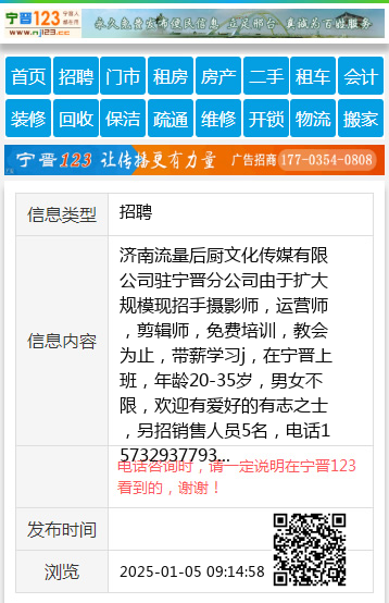 济南流量后厨文化传媒有限公司驻宁晋分公司由于扩大规模现招手摄影师,运营师,剪辑师,免费培训,教会为止,带薪学习j,在宁晋上班,年龄20-35岁,男女不限,欢迎有爱好的有志之士,另招销售人员5名,电话15732937793 【电话咨询时,请一定说明在宁晋123看到的,谢谢!】 |