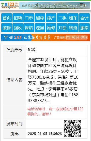 全屋定制设计师,能独立设计效果图并向客户讲解设计构思。年龄26岁~50岁,工资7500加提成,保底年薪10万元,熟练操作三维家者优先。地点:宁晋慕思V6家居(东菜市场对过)电话15833387877 【电话咨询时,请一定说明在宁晋123看到的,谢谢!】 |