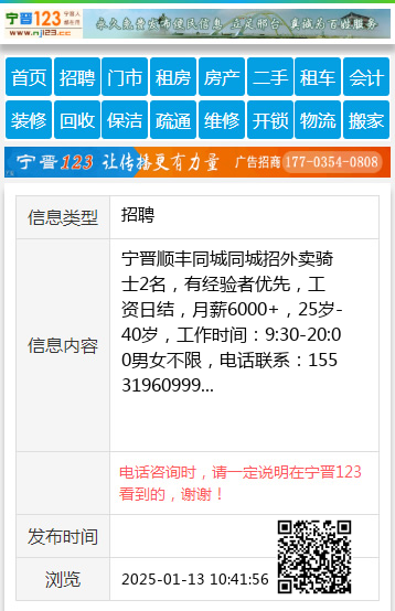 宁晋顺丰同城同城招外卖骑士2名,有经验者优先,工资日结,月薪6000+,25岁-40岁,工作时间:9:30-20:00男女不限,电话联系:15531960999 【电话咨询时,请一定说明在宁晋123看到的,谢谢!】 |