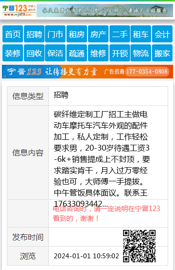 碳纤维定制工厂招工主做电动车摩托车汽车外观的配件加工,私人定制,工作轻松要求男,20-30岁待遇工资3-6k+销售提成上不封顶,要求踏实肯干,月入过万零经验也可,大师傅一手提拔。中午管饭具体面议。联系王17633093442 【电话咨询时,请一定说明在宁晋123看到的,谢谢!】 |