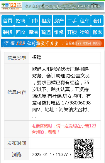 欧尚太阳能光伏板厂现招聘财务、会计助理.办公室文员,要求已婚已育有经验,35岁以下、踏实认真,工资待遇优厚.有社保.男女均可、有意可拨打电话:17798006098同V、地址:河渠镇大召村、