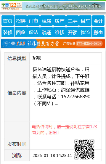 极兔速递招聘快递分拣,扫描人员,计件提成,下午班,适合各种兼职,补贴家用,工作地点:韵泽通供应链,联系电话:15227666890(不同V) 【电话咨询时,请一定说明在宁晋123看到的,谢谢!】 |