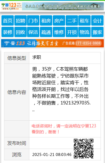 男,35岁,C本驾照车辆都能熟练驾驶,宁纺跟东菜市场附近居住,踏实肯干,性格活泼开朗,找过年以后各种各样长期工作等,不外出,不做销售,19213297035 【电话咨询时,请一定说明在宁晋123看到的,谢谢!】 |