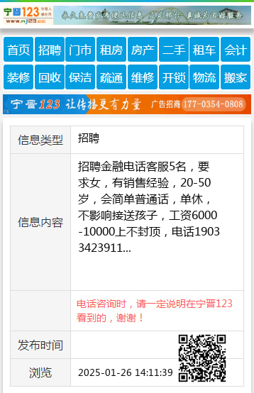 招聘金融电话客服5名,要求女,有销售经验,20-50岁,会简单普通话,单休,不影响接送孩子,工资6000-10000上不封顶,电话19033423911 【电话咨询时,请一定说明在宁晋123看到的,谢谢!】 |