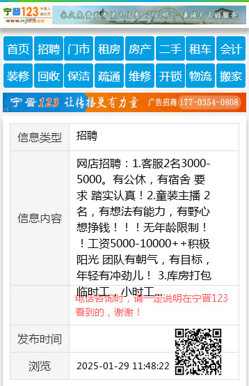 网店招聘:1.客服2名3000-5000。有公休,有宿舍 要求 踏实认真!2.童装主播 2名,有想法有能力,有野心想挣钱!!!无年龄限制!!工资5000-10000++积极阳光 团队有朝气,有目标,年轻有冲劲儿! 3.库房打包临时工,小时工2名,长白班。库房有空调!有工作经验者优先录用!!!地址:东亚 菜市场 大医院附近 县城 ,联系电话15533197597 【电话咨询时,请一定说明在宁晋123看到的,谢谢!】 |