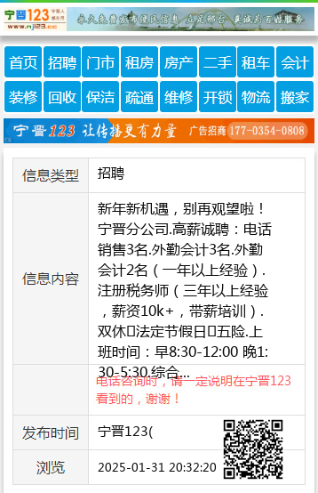 新年新机遇,别再观望啦!宁晋分公司.高薪诚聘:电话销售3名.外勤会计3名.外勤会计2名(一年以上经验).注册税务师(三年以上经验,薪资10k+,带薪培训).双休➕法定节假日➕五险.上班时间:早8:30-12:00 晚1:30-5:30.综合薪资5000+.
