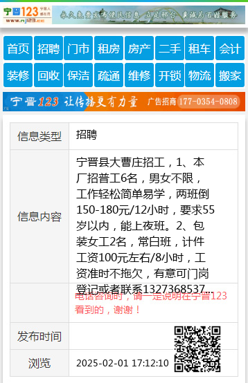 宁晋县大曹庄招工,1、本厂招普工6名,男女不限,工作轻松简单易学,两班倒150-180元/12小时,要求55岁以内,能上夜班。2、包装女工2名,常白班,计件工资100元左右/8小时,工资准时不拖欠,有意可门岗登记或者联系13273685370 【电话咨询时,请一定说明在宁晋123看到的,谢谢!】 |